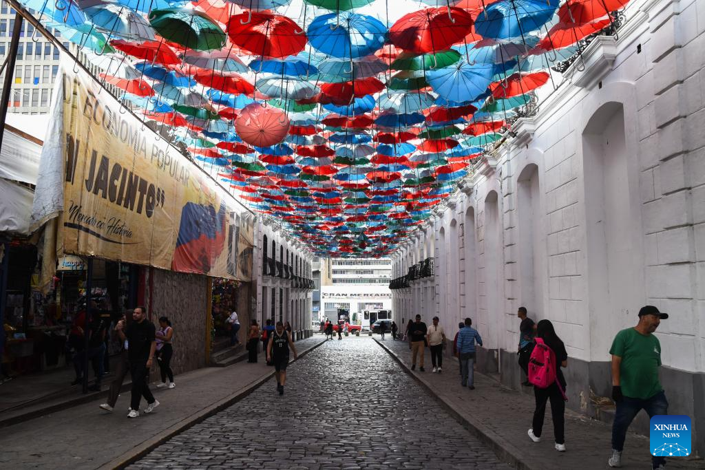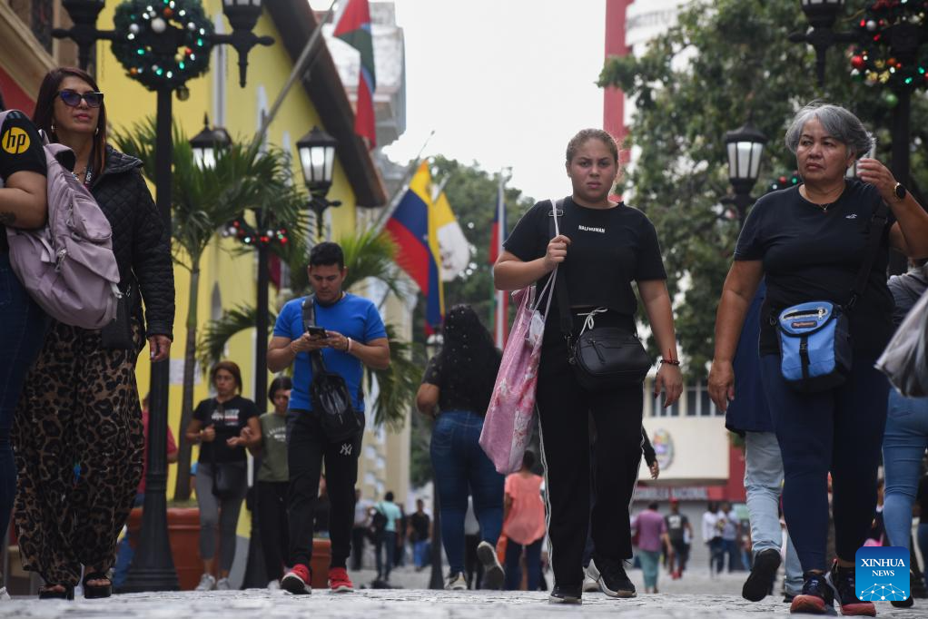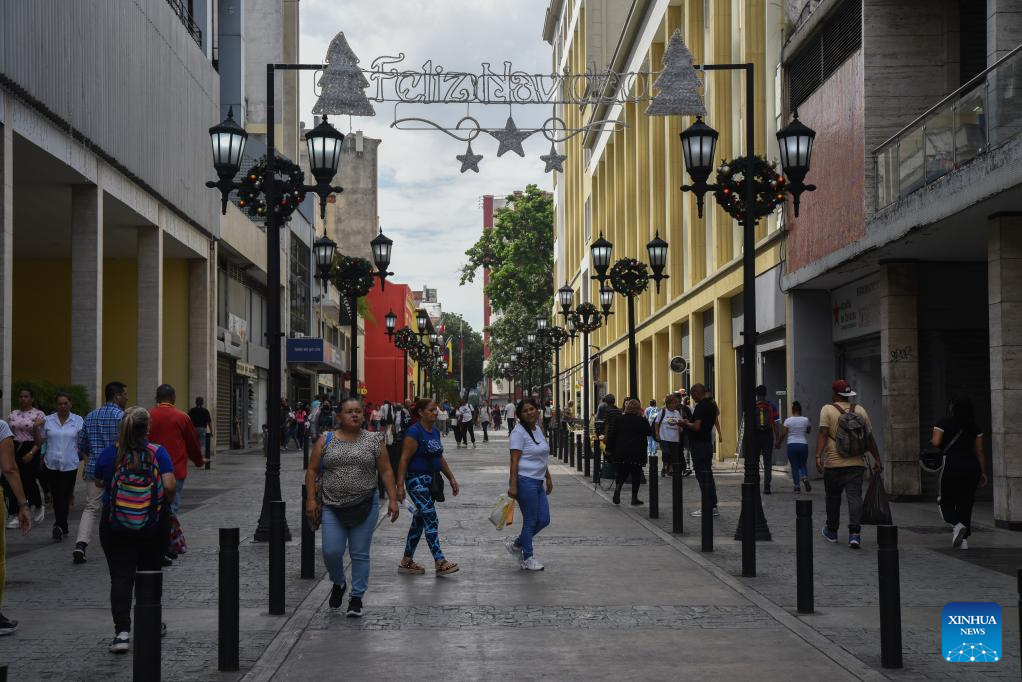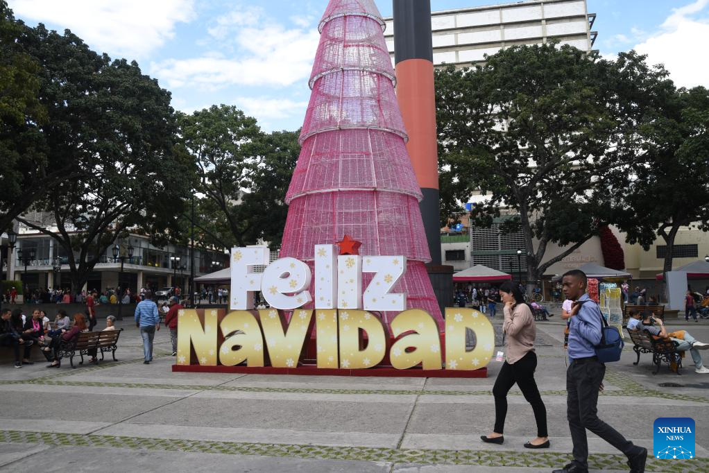 CARACAS, 17 noviembre, 2025 (Xinhua) -- Personas caminan frente a decoraciones navideñas en una plaza, en Caracas, Venezuela, el 17 de noviembre de 2025. (Xinhua/Marcos Salgado)