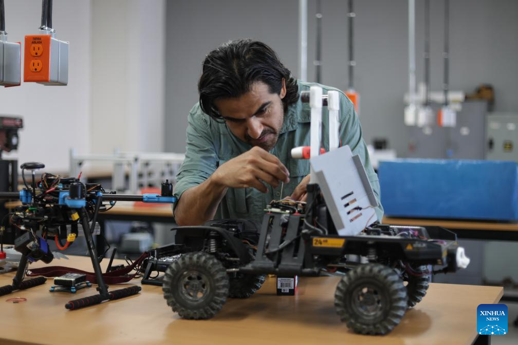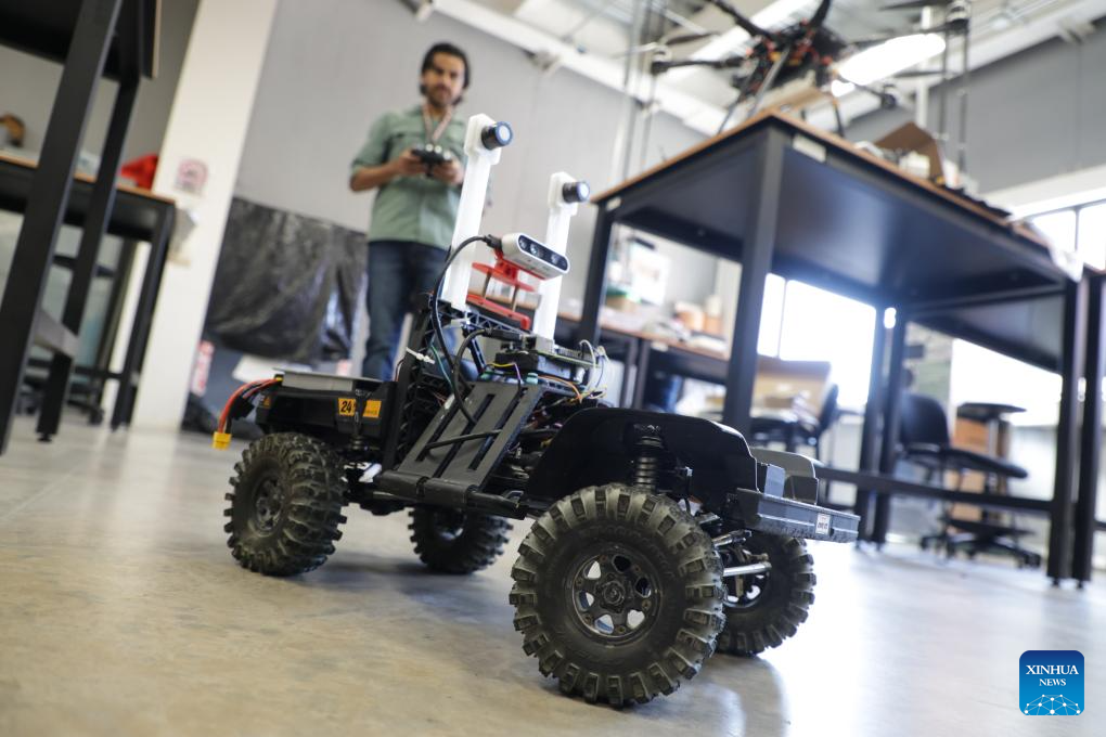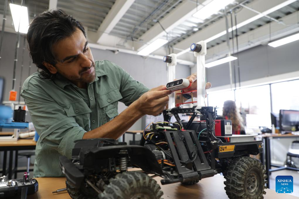 CIUDAD DE MEXICO, 21 noviembre, 2025 (Xinhua) -- Imagen del 19 de noviembre de 2025 del doctor, Rodolfo Vera Amaro, de la Unidad Profesional Interdisciplinaria en Ingeniería y Tecnologías Avanzadas del Instituto Politécnico Nacional (IPN) de México, realizando pruebas con un vehículo robótico (rover), en la Ciudad de México, capital de México. Estudiantes del IPN de México desarrollaron un rover, equipado con redes neuronales y visión artificial, capaz de identificar riesgos geológicos, detectar condiciones extremas y reconocer la presencia de gases tóxicos en zonas mineras. (Xinhua/Francisco Cañedo)