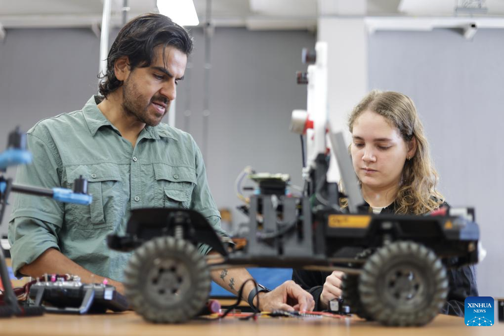 CIUDAD DE MÉXICO, 21 noviembre, 2025 (Xinhua) -- Imagen del 19 de noviembre de 2025 del doctor, Rodolfo Vera Amaro (i), de la Unidad Profesional Interdisciplinaria en Ingeniería y Tecnologías Avanzadas del Instituto Politécnico Nacional (IPN) de México, y una alumna trabajando en un vehículo robótico (rover), en la Ciudad de México, capital de México. Estudiantes del IPN de México desarrollaron un rover, equipado con redes neuronales y visión artificial, capaz de identificar riesgos geológicos, detectar condiciones extremas y reconocer la presencia de gases tóxicos en zonas mineras. (Xinhua/Francisco Cañedo)