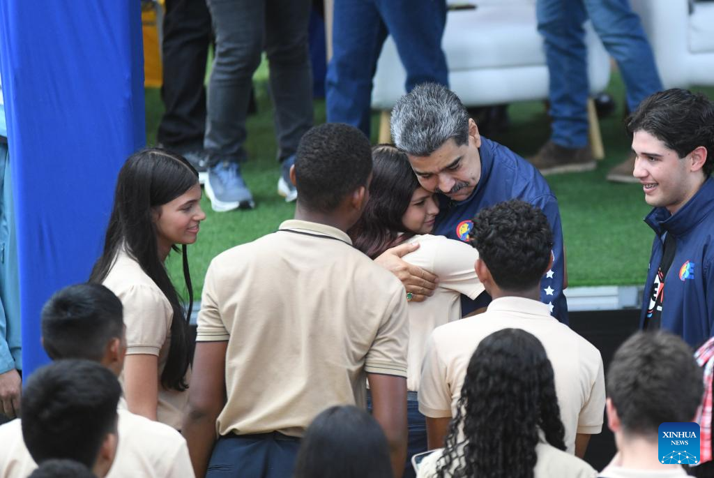 CARACAS, 21 noviembre, 2025 (Xinhua) -- El presidente venezolano, Nicolás Maduro (2-d-atrás), abraza a una estudiante durante un acto por el Día del Estudiante Venezolano, en Caracas, Venezuela, el 21 de noviembre de 2025. Los estudiantes venezolanos se movilizaron el viernes en Caracas para celebrar su día y en defensa de la paz y la educación. (Xinhua/Marcos Salgado)