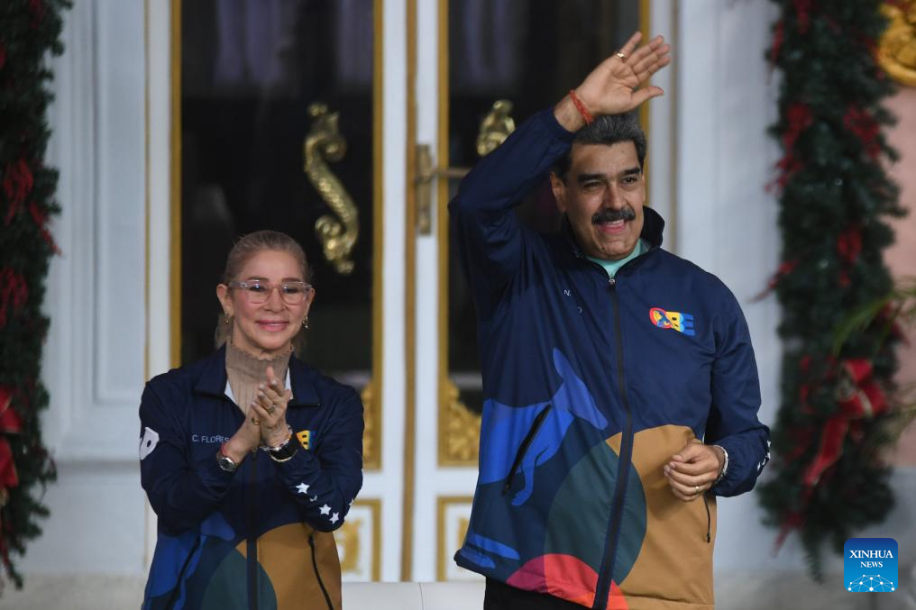 CARACAS, 21 noviembre, 2025 (Xinhua) -- El presidente venezolano, Nicolás Maduro (d), saluda junto a la primera dama venezolana, Cilia Flores (i), durante un acto por el Día del Estudiante Venezolano, en Caracas, Venezuela, el 21 de noviembre de 2025. Los estudiantes venezolanos se movilizaron el viernes en Caracas para celebrar su día y en defensa de la paz y la educación. (Xinhua/Marcos Salgado)