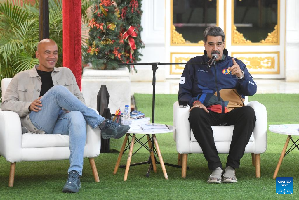 CARACAS, 21 noviembre, 2025 (Xinhua) -- El presidente venezolano, Nicolás Maduro (d), y el ministro de Educación venezolano, Héctor Rodríguez (i), participan durante un acto por el Día del Estudiante Venezolano, en Caracas, Venezuela, el 21 de noviembre de 2025. Los estudiantes venezolanos se movilizaron el viernes en Caracas para celebrar su día y en defensa de la paz y la educación. (Xinhua/Marcos Salgado)