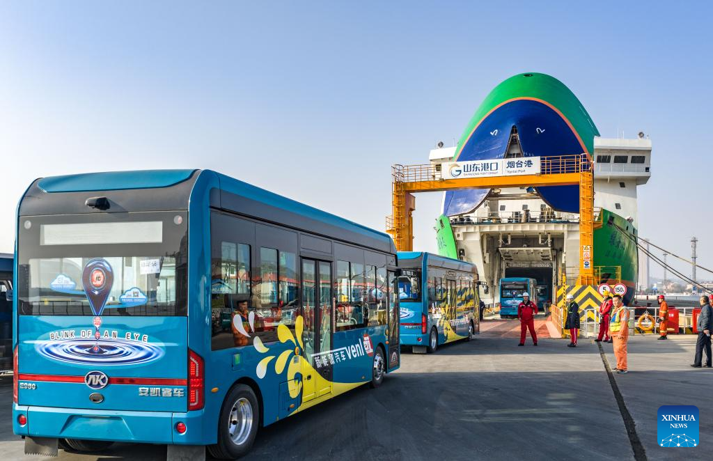 JINAN, 30 noviembre, 2025 (Xinhua) -- Imagen tomada con un dron el 30 de noviembre de 2025 de autobuses eléctricos abordando un transportador de vehículos de nueva energía (NEV, por sus siglas en inglés) en el Puerto de Yantai, en la provincia de Shandong, en el este de China. (Xinhua/Tang Ke)