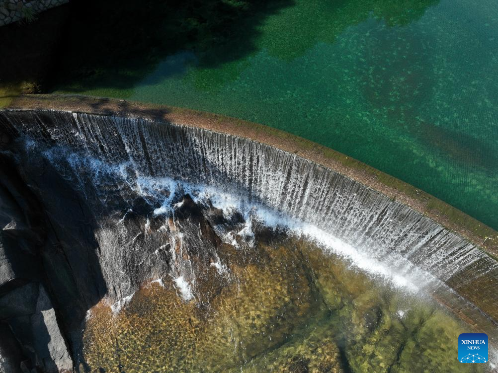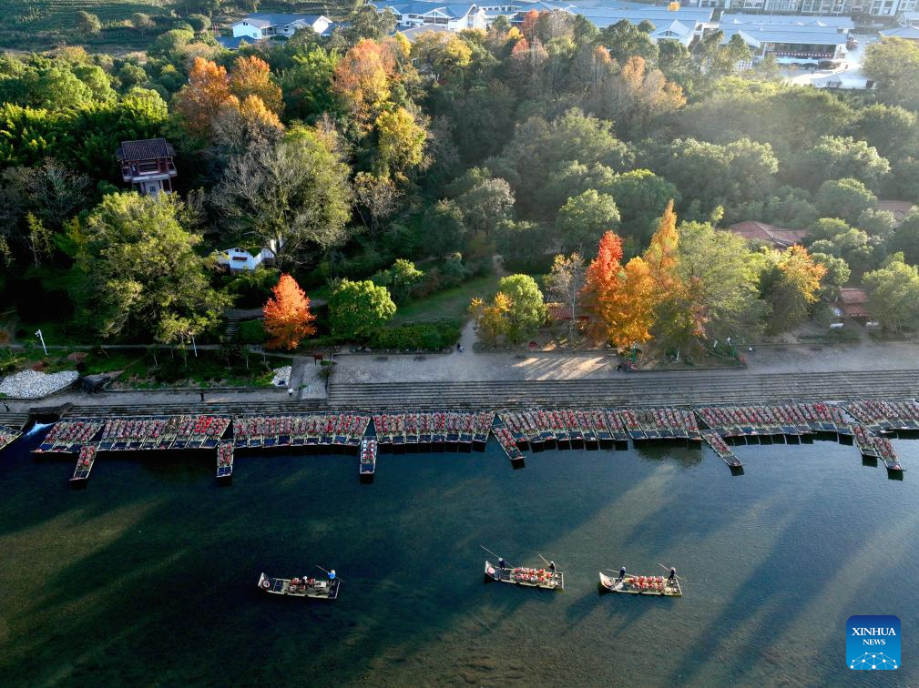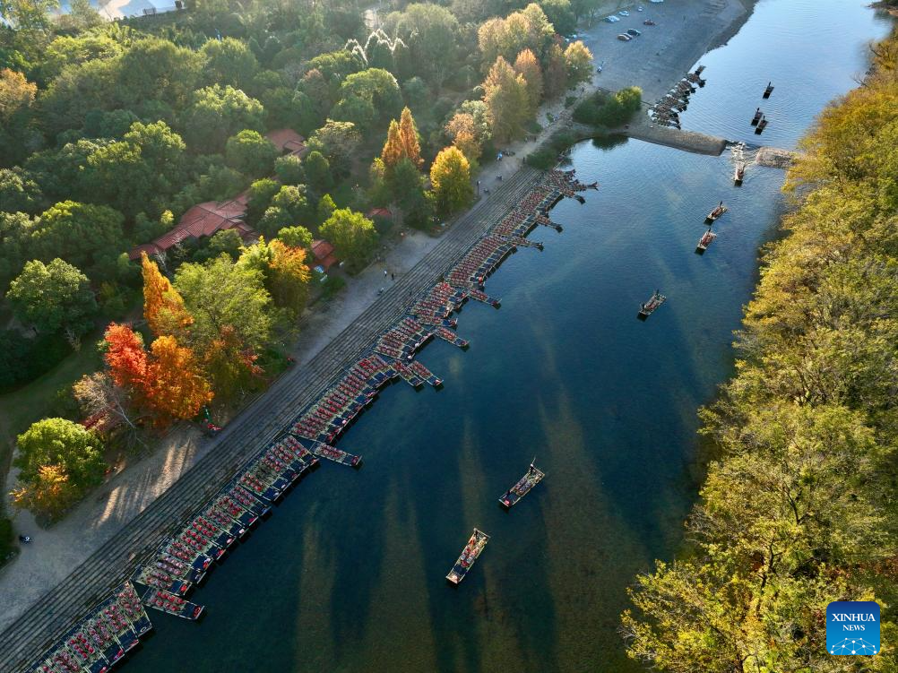 WUYISHAN, 2 diciembre, 2025 (Xinhua) -- Vista aérea tomada con un dron el 30 de noviembre de 2025 de un muelle del río Jiuqu, en el Parque Nacional Wuyishan, en la provincia de Fujian, en el sureste de China. (Xinhua/Jiang Kehong)