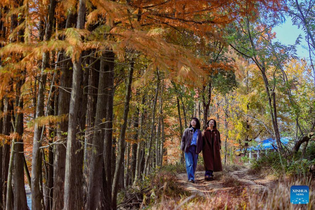 BEIJING, 2 diciembre, 2025 (Xinhua) -- Imagen del 1 de diciembre de 2025 de turistas disfrutando del paisaje en un bosque de metasequoia, en la ciudad de Lanxi, en la provincia de Zhejiang, en el este de China. (Xinhua/Shi Kuanbing)