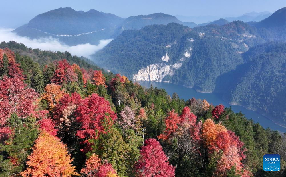 BEIJING, 2 diciembre, 2025 (Xinhua) -- Vista aérea tomada con un dron el 1 de diciembre de 2025 de un bosque, en el poblado de Zhushan del distrito de Xuan'en, en la prefectura autónoma tujia y miao de Enshi, en la provincia de Hubei, en el centro de China. (Xinhua/Song Wen)
