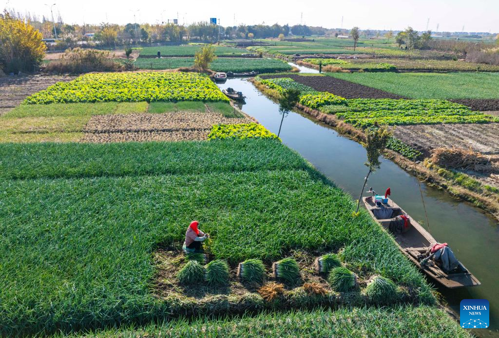 BEIJING, 6 diciembre, 2025 (Xinhua) -- Vista aérea tomada con un dron el 6 de diciembre de 2025 de un agricultor cosechando cebollino, en la ciudad de Xinghua, en la provincia de Jiangsu, en el este de China. A medida que se acerca el término solar de la Gran Nevada, también conocido como "Da Xue" en chino, los agricultores están atareados con la producción agrícola en todo el país. (Xinhua/Zhou Shegen)
