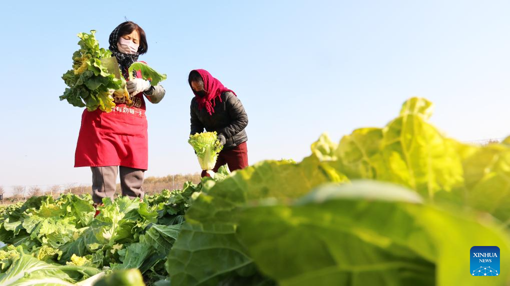 BEIJING, 6 diciembre, 2025 (Xinhua) -- Imagen del 4 de diciembre de 2025 de agricultoras cosechando coles chinas, en la ciudad de Lianyungang, en la provincia de Jiangsu, en el este de China. A medida que se acerca el término solar de la Gran Nevada, también conocido como "Da Xue" en chino, los agricultores están atareados con la producción agrícola en todo el país. (Xinhua/Geng Yuhe)