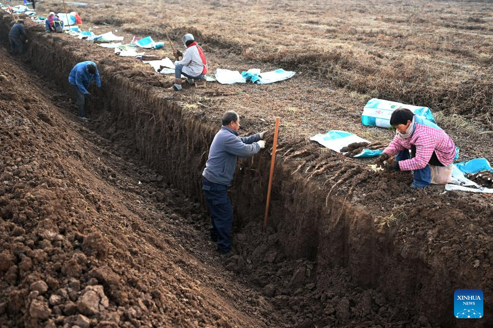 BEIJING, 6 diciembre, 2025 (Xinhua) -- Agricultores cosechan plantas medicinales chinas, en la ciudad de Jiaozuo, en la provincia de Henan, en el centro de China, el 6 de diciembre de 2025. A medida que se acerca el término solar de la Gran Nevada, también conocido como "Da Xue" en chino, los agricultores están atareados con la producción agrícola en todo el país. (Xinhua/Xu Hongxing)