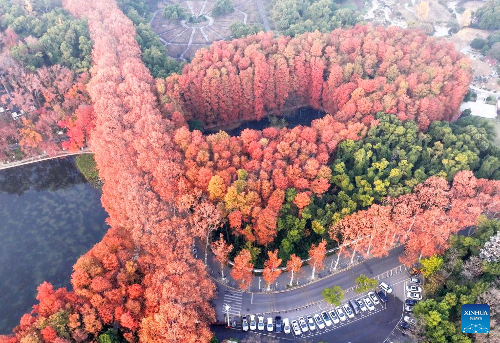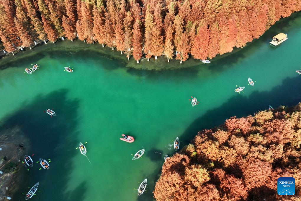 BEIJING, 6 diciembre, 2025 (Xinhua) -- Vista aérea tomada con un dron el 6 de diciembre de 2025 de personas tomando botes para hacer turismo en un bosque acuático, en Changzhou, en la provincia de Jiangsu, en el este de China. (Xinhua/Chen Wei)