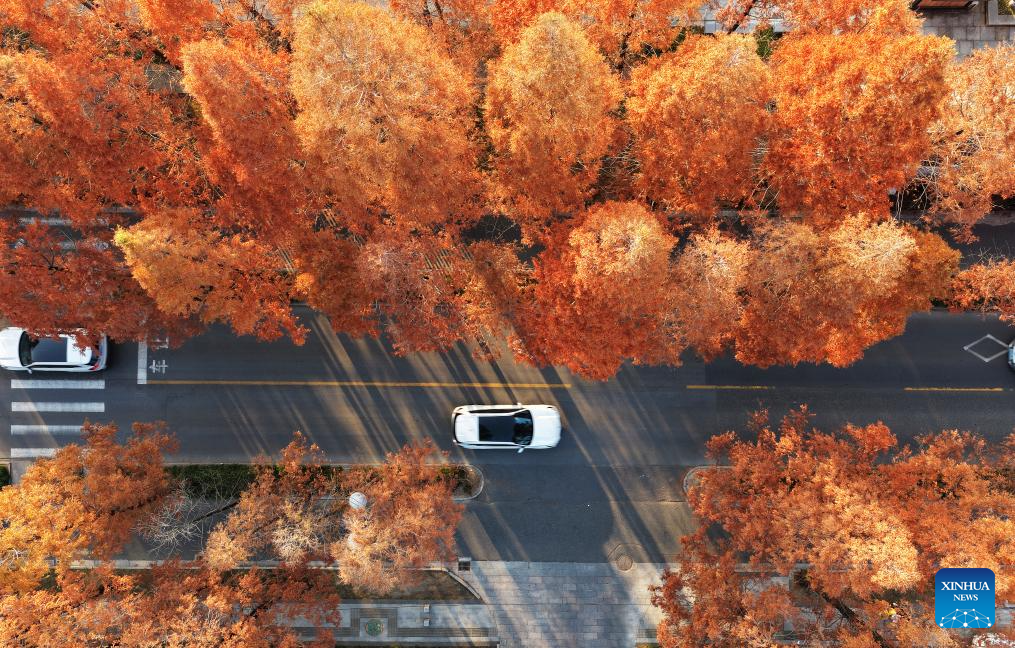 BEIJING, 6 diciembre, 2025 (Xinhua) -- Vista aérea tomada con un dron el 6 de diciembre de 2025 de automóviles circulando por una carretera flanqueada por metasecuoyas, en la ciudad de Yangzhou, en la provincia de Jiangsu, en el este de China. (Xinhua/Meng Delong)