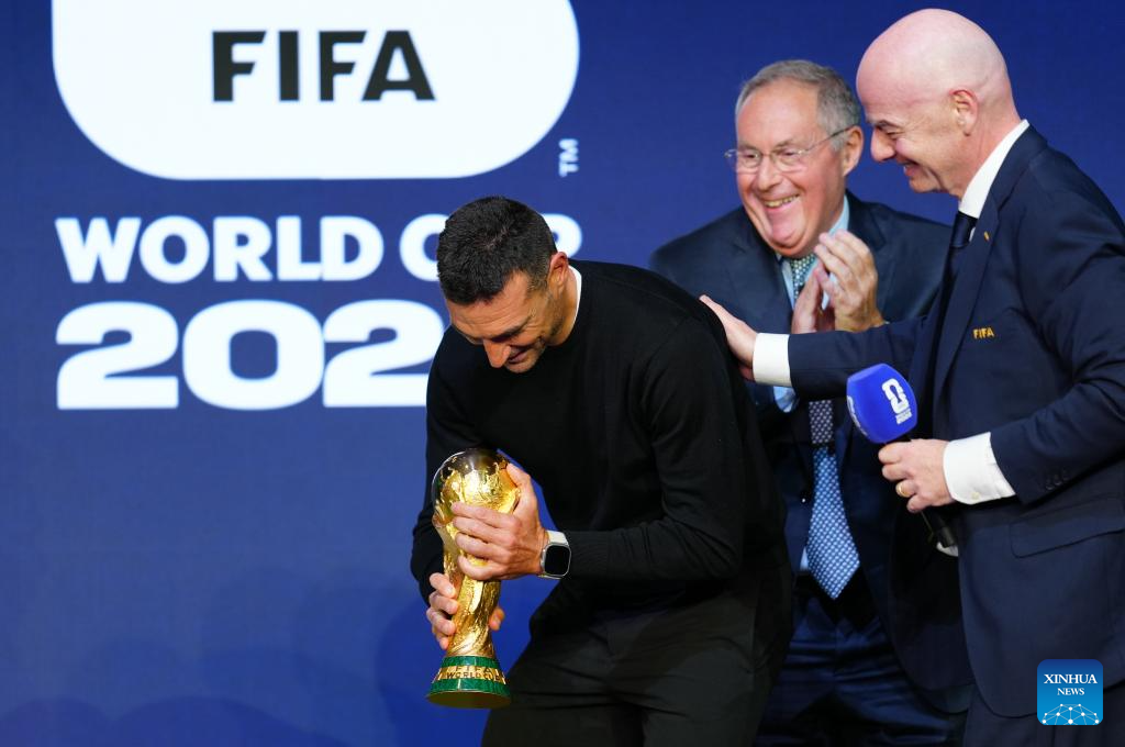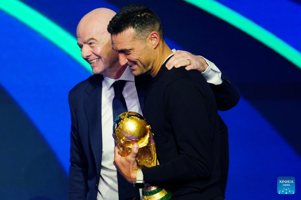 WASHINGTON D. C., 7 diciembre, 2025 (Xinhua) -- Imagen del 6 de diciembre de 2025 del director técnico, Lionel Scaloni (i), de Argentina, sosteniendo el trofeo de la Copa Mundial de la FIFA, durante la develación del calendario de partidos para la Copa Mundial 2026, en Washington D. C., Estados Unidos. (Xinhua/Jia Haocheng)
