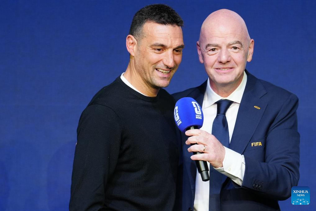 WASHINGTON D. C., 7 diciembre, 2025 (Xinhua) -- Imagen del 6 de diciembre de 2025 del presidente de la FIFA, Gianni Infantino (i), y el director técnico, Lionel Scaloni, de Argentina, vistos durante la develación del calendario de partidos para la Copa Mundial 2026, en Washington D. C., Estados Unidos. (Xinhua/Jia Haocheng)