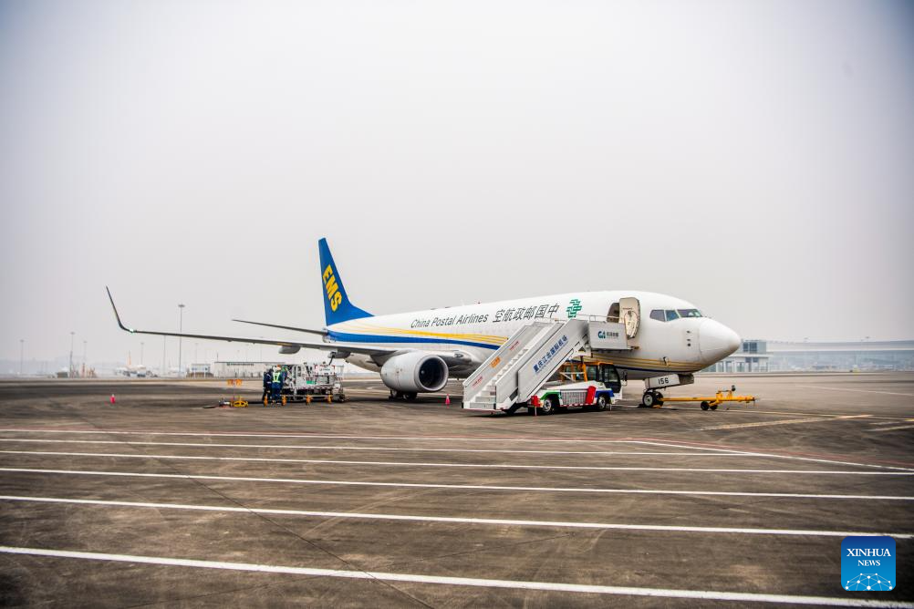 CHONGQING, 9 diciembre, 2025 (Xinhua) -- Imagen del 9 de diciembre de 2025 de un avión de China Postal Airlines esperando para realizar el vuelo inaugural de la ruta de carga Chongqing-Yangón en el Aeropuerto Internacional Jiangbei de Chongqing, en el municipio de Chongqing, en el suroeste de China. Una ruta internacional de carga que conecta la municipalidad de Chongqing, en el suroeste de China, y Yangon, en Myanmar, realizó con éxito su vuelo inaugural el martes. (Xinhua/Tang Yi)