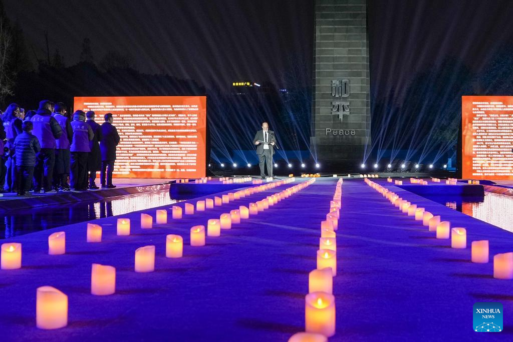 NANJING, 13 diciembre, 2025 (Xinhua) -- Christoph Reinhardt, bisnieto de John Rabe, un alemán recordado por proteger a cientos de miles de civiles chinos durante la Masacre de Nanjing en 1937, habla durante una vigilia con velas encendidas en el Salón Conmemorativo de las Víctimas de la Masacre de Nanjing cometida por los Invasores Japoneses, en Nanjing, capital de la provincia de Jiangsu, en el este de China, el 13 de diciembre de 2025. Una vigilia con velas encendidas se llevó a cabo el sábado en el salón conmemorativo, que fue el 12º día nacional de conmemoración por las víctimas de la Masacre de Nanjing. (Xinhua/Li Bo)