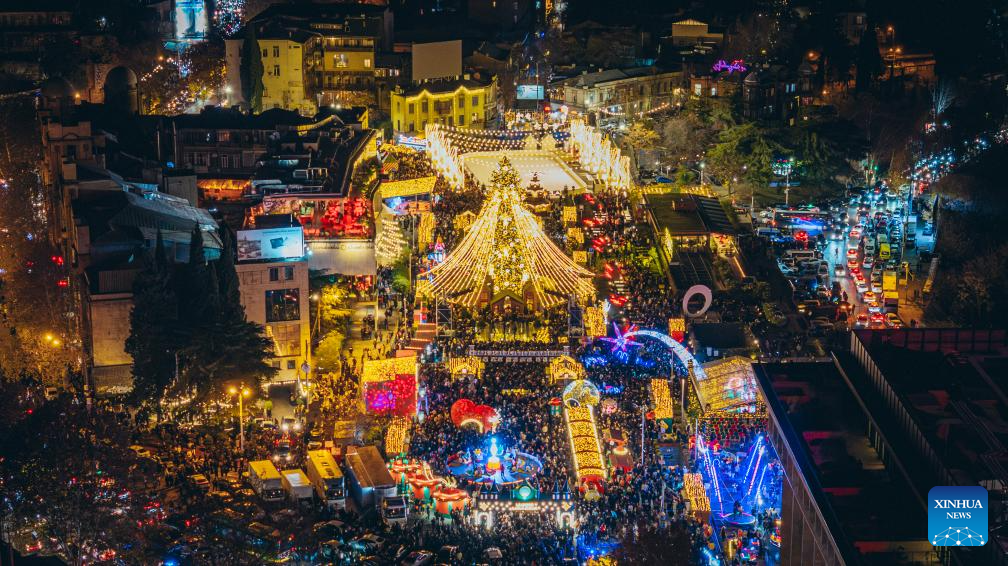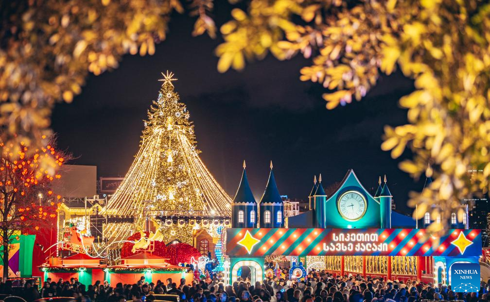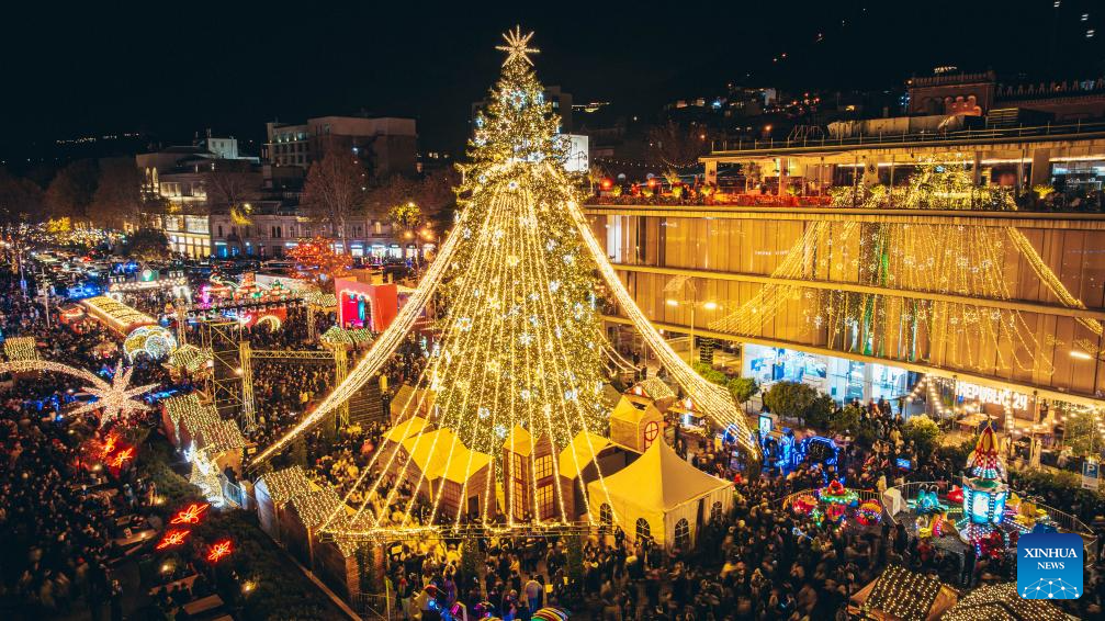 TIFLIS, 13 diciembre, 2025 (Xinhua) -- Imagen del 12 de diciembre de 2025 del árbol principal iluminado de Año Nuevo de Georgia y otras decoraciones vistas en la Plaza de la Primera República, en Tiflis, Georgia. (Xinhua/Gobierno de la Ciudad de Tiflis)