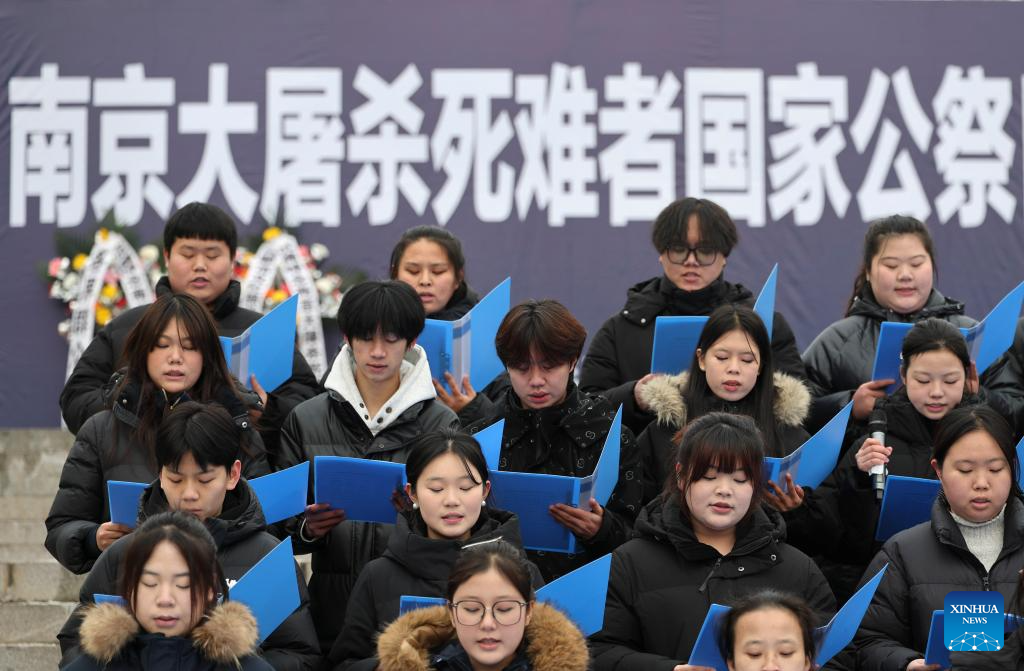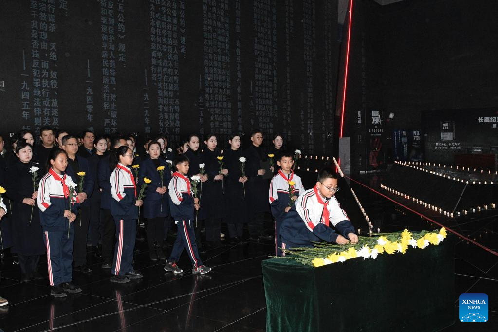 BEIJING, 13 diciembre, 2025 (Xinhua) -- Una ceremonia conmemorativa para las víctimas de la Masacre de Nanjing se lleva a cabo en la Sala de Exhibición de Evidencias de Crímenes Cometidos por la Unidad 731 del Ejército Imperial Japonés, en Harbin, capital de la provincia de Heilongjiang, en el noreste de China, el 13 de diciembre de 2025. El 12º día nacional de conmemoración en honor a las 300.000 víctimas asesinadas por las tropas japonesas durante la Masacre de Nanjing se celebró el sábado en esta ciudad china, en un año en el que se cumple el 80º aniversario del fin de la Segunda Guerra Mundial. (Xinhua/Liu Yang)