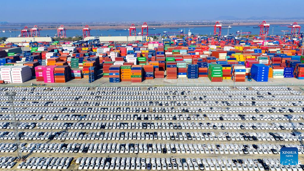 Vista aérea tomada con un dron el 14 de diciembre de 2025 de vehículos fabricados en China esperando a ser exportados en un muelle de contenedores del puerto de Nanjing, en la provincia de Jiangsu, en el este de China. La economía de China mantuvo un impulso estable en noviembre, creando condiciones favorables para alcanzar el objetivo de crecimiento anual, según revelan los últimos indicadores económicos publicados el lunes. En noviembre, la producción industrial de valor agregado del país se expandió un 4,8 por ciento interanual. En los primeros 11 meses, la producción industrial aumentó un 6 por ciento. (Xinhua/Yang Suping)
