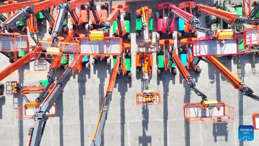 Vista aérea tomada con un dron el 15 de diciembre de 2025 de empleados examinando plataformas inteligentes de trabajo aéreas para exportar en una compañía de maquinaria, en el poblado de Leidian, en Huzhou, en la provincia de Zhejiang, en el este de China. La economía de China mantuvo un impulso estable en noviembre, creando condiciones favorables para alcanzar el objetivo de crecimiento anual, según revelan los últimos indicadores económicos publicados el lunes. En noviembre, la producción industrial de valor agregado del país se expandió un 4,8 por ciento interanual. En los primeros 11 meses, la producción industrial aumentó un 6 por ciento. (Xinhua/Xie Sangguo)