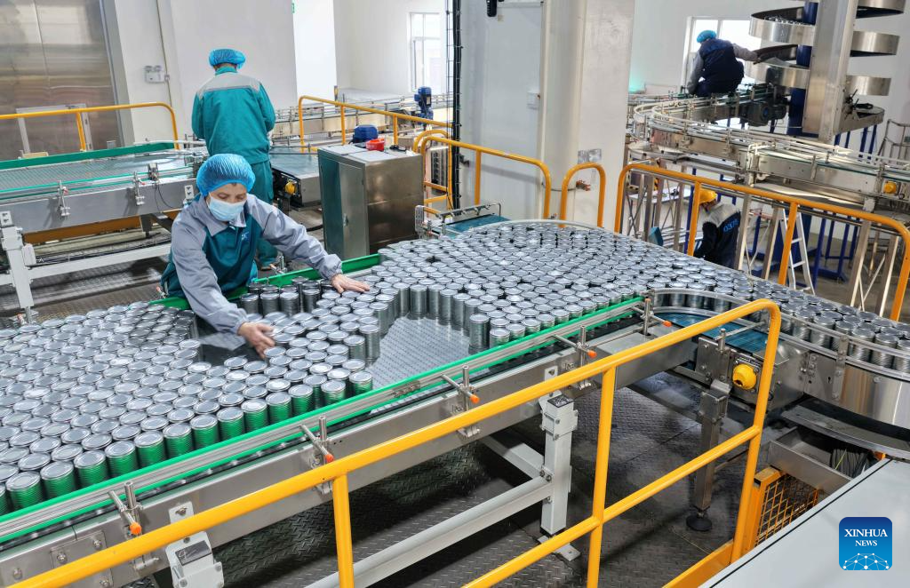 Trabajadores son vistos en una línea de producción de alimentos de un parque industrial de alimento para mascotas, en Linyi, en la provincia de Shandong, en el este de China, el 15 de diciembre de 2025. La economía de China mantuvo un impulso estable en noviembre, creando condiciones favorables para alcanzar el objetivo de crecimiento anual, según revelan los últimos indicadores económicos publicados el lunes. En noviembre, la producción industrial de valor agregado del país se expandió un 4,8 por ciento interanual. En los primeros 11 meses, la producción industrial aumentó un 6 por ciento. (Xinhua/Wang Yanbing)