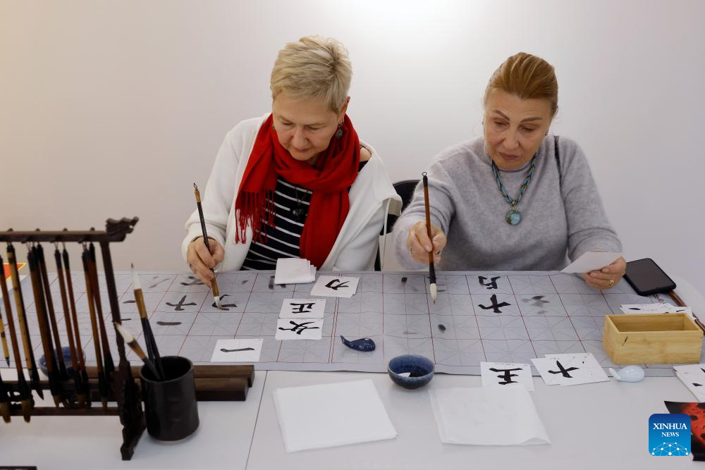 BUCAREST, 14 diciembre, 2025 (Xinhua) -- Imagen del 13 de diciembre de 2025 de invitados probando caligrafía tradicional china durante el día de apertura de la 4ª edición de la Feria del Libro Buchina en el Centro Cultural Chino, en Bucarest, Rumanía. Buchina es una feria del libro dedicada a la literatura, la cultura y el arte chinos. (Xinhua/Cristian Cristel)