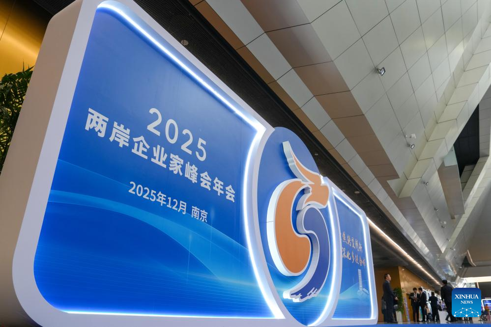 NANJING, 16 diciembre, 2025 (Xinhua) -- Imagen del 16 de diciembre de 2025 de un panel informativo a la entrada de la sede principal de la conferencia anual 2025 de la Cumbre de Directores Ejecutivos a través del Estrecho, en Nanjing, en la provincia de Jiangsu, en el este de China. La conferencia anual 2025 de la Cumbre de Directores Ejecutivos a través del Estrecho fue inaugurada aquí el martes. Cerca de 800 personas procedentes de la parte continental de China y Taiwan se reunieron el martes en Nanjing para debatir sobre la transformación industrial, la innovación y la cooperación entre ambos lados del estrecho. (Xinhua/Li Bo)