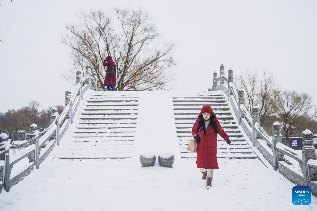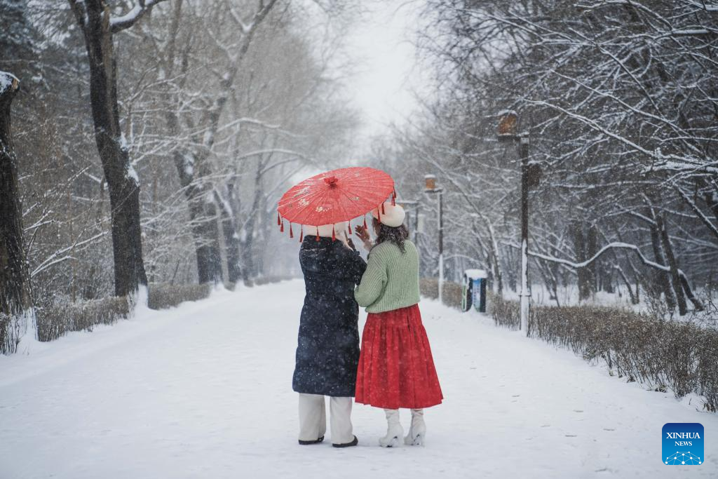 CHANGCHUN, 23 diciembre, 2025 (Xinhua) -- Personas disfrutan de la vista de la nevada en un parque, en Changchun, en la provincia de Jilin, en el noreste de China, el 23 de diciembre de 2025. Changchun registró el martes nevadas debido al impacto de un nuevo frente frío. (Xinhua/Xu Chang)