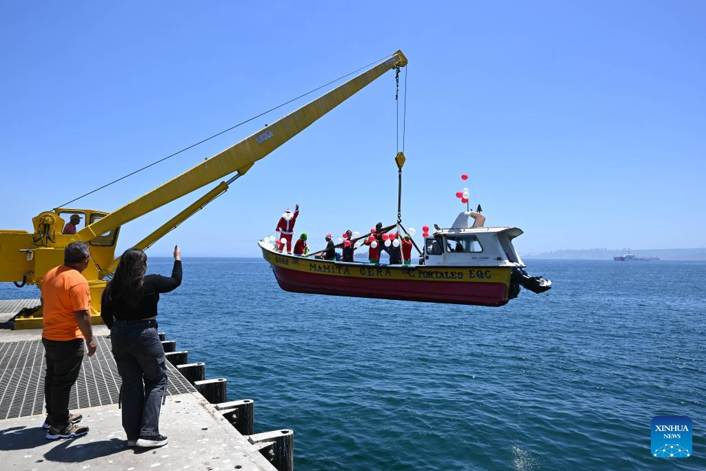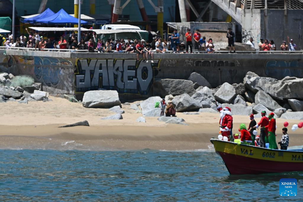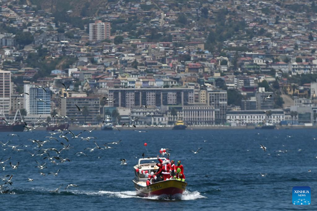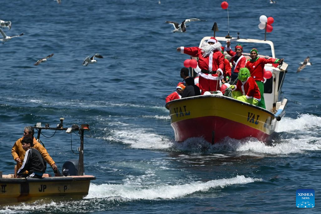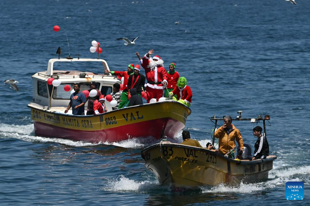 VALPARAISO, 24 diciembre, 2025 (Xinhua) -- Una persona caracterizada como el Viejito Pascuero (Santa Claus) saluda mientras navega a bordo de un bote pesquero durante un evento navideño celebrado en la Caleta Portales, en la ciudad de Valparaíso, Chile, el 24 de diciembre de 2025. (Xinhua/Jorge Villegas)