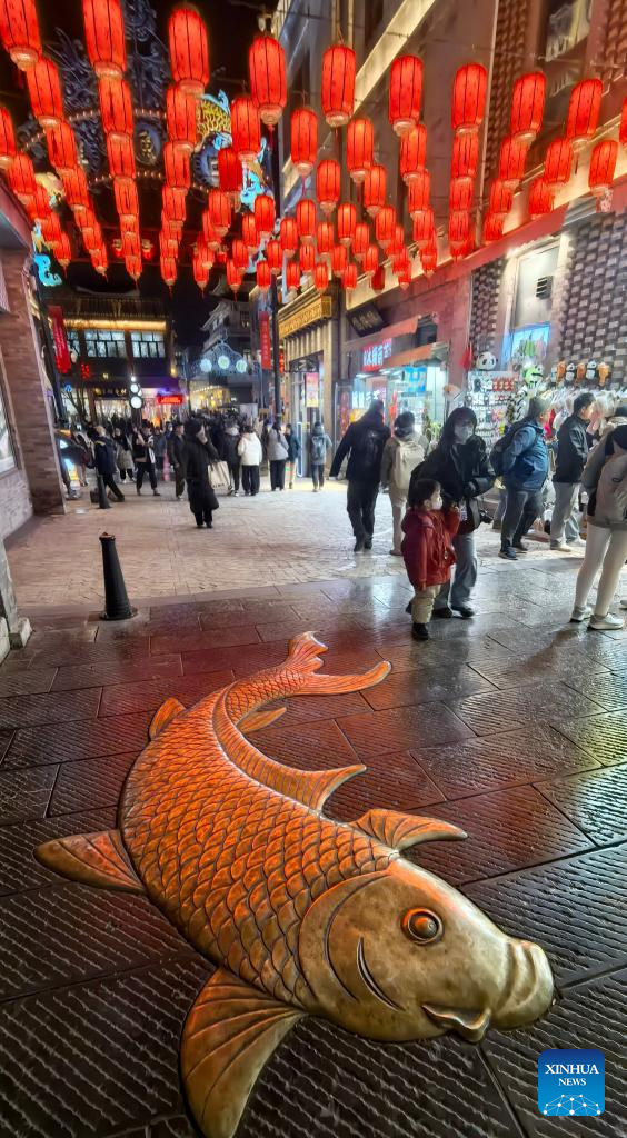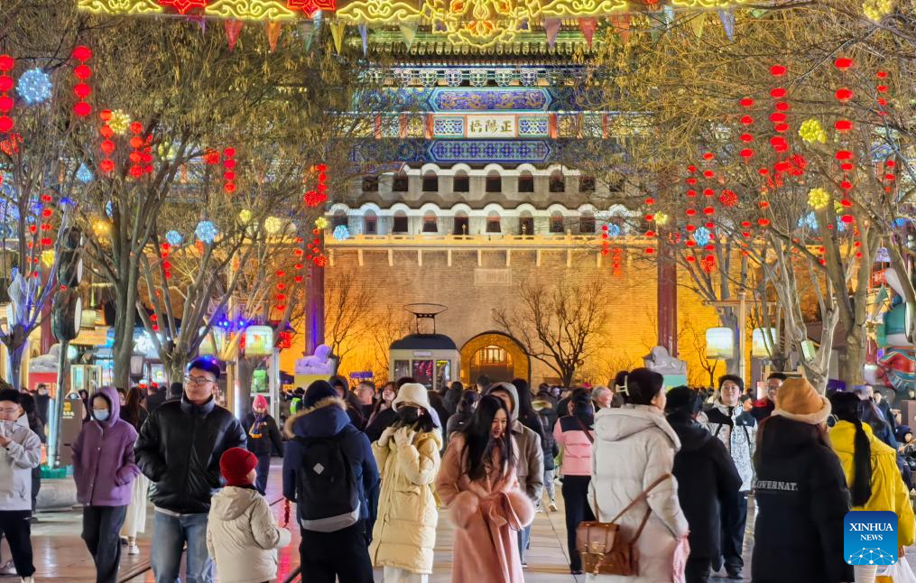 BEIJING, 27 diciembre, 2025 (Xinhua) -- Imagen del 26 de diciembre de 2025 de personas disfrutando de la vista nocturna en la calle peatonal Qianmen, en Beijing, capital de China. A medida que se acerca el Año Nuevo, la calle peatonal Qianmen, una emblemática calle comercial de Beijing, está decorada con diversos festones. (Xinhua/Li Xin)
