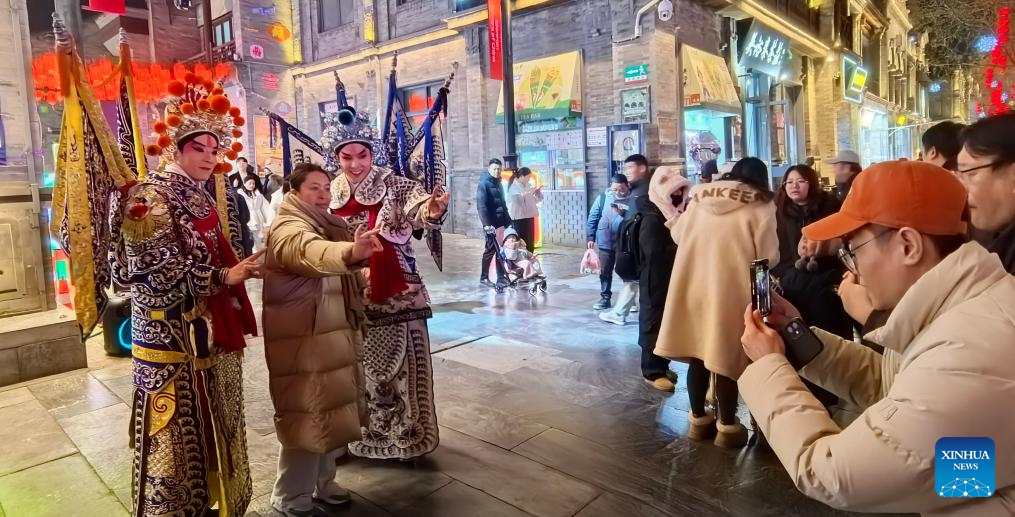 BEIJING, 27 diciembre, 2025 (Xinhua) -- Imagen del 26 de diciembre de 2025 de una visitante posando para una fotografía con artistas en la calle peatonal Qianmen, en Beijing, capital de China. A medida que se acerca el Año Nuevo, la calle peatonal Qianmen, una emblemática calle comercial de Beijing, está decorada con diversos festones. (Xinhua/Li Xin)