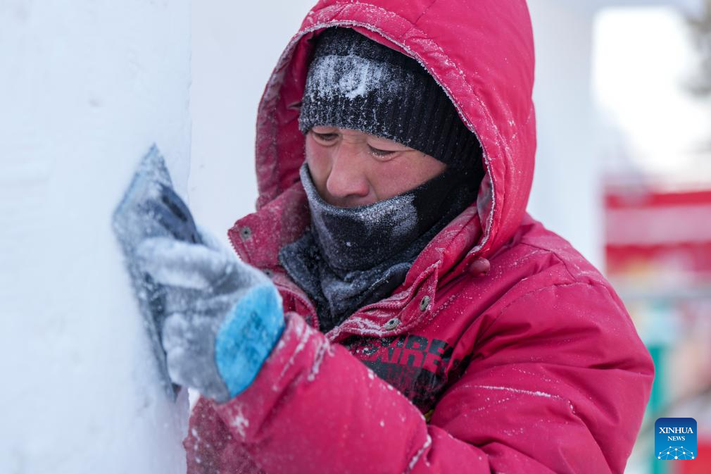 HARBIN, 27 diciembre, 2025 (Xinhua) -- Imagen del 26 de diciembre de 2025 de un artesano trabajando con una escultura de nieve en la sede de la 38 Exposición Internacional de Arte de Esculturas de Nieve de la Isla del Sol, en Harbin, en la provincia de Heilongjiang, en el noreste de China. La 38 Exposición Internacional de Arte de Esculturas de Nieve de la Isla del Sol se inauguró aquí para su prueba el sábado, con un área de exposición de 1,5 millones de metros cuadrados y un volumen de utilización de nieve de 120.000 metros cúbicos. (Xinhua/Wang Song)