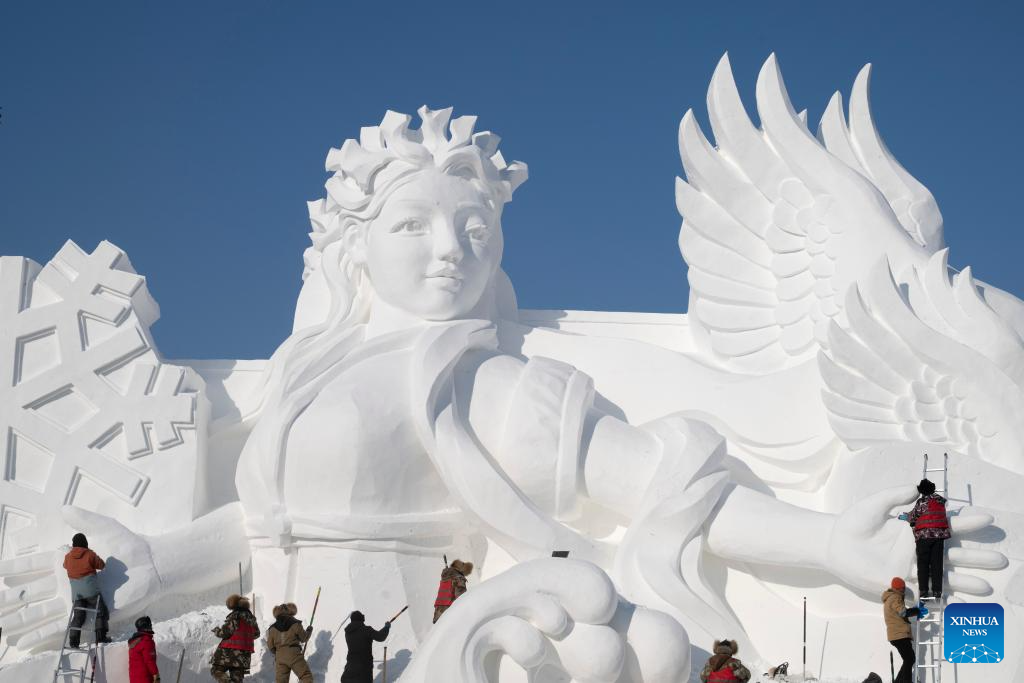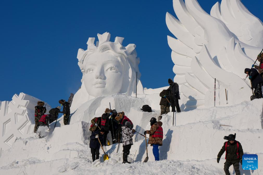 HARBIN, 27 diciembre, 2025 (Xinhua) -- Imagen del 26 de diciembre de 2025 de artesanos trabajando en una escultura de nieve en la sede de la 38 Exposición Internacional de Arte de Esculturas de Nieve de la Isla del Sol, en Harbin, en la provincia de Heilongjiang, en el noreste de China. La 38 Exposición Internacional de Arte de Esculturas de Nieve de la Isla del Sol se inauguró aquí para su prueba el sábado, con un área de exposición de 1,5 millones de metros cuadrados y un volumen de utilización de nieve de 120.000 metros cúbicos. (Xinhua/Wang Song)