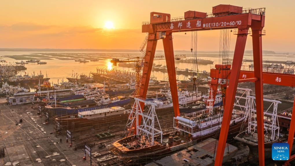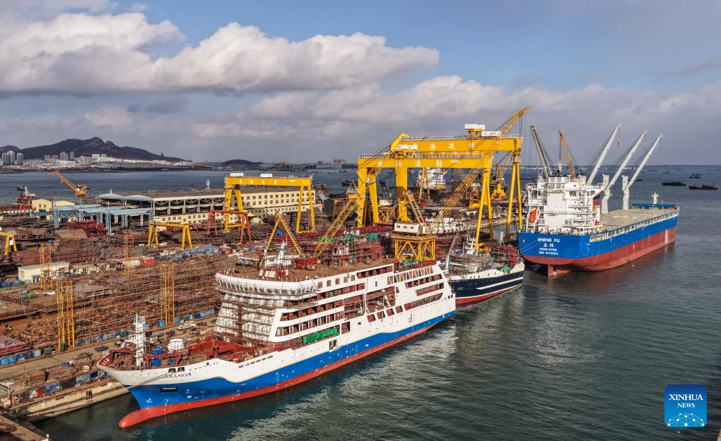 JINAN, 28 diciembre, 2025 (Xinhua) -- Vista aérea tomada con un dron el 24 de diciembre de 2025 de una empresa de construcción naval realizando trabajos de construcción de barcos, en Rongcheng, en la provincia de Shandong, en el este de China. En los últimos años, Shandong se ha comprometido a construir un clúster industrial de alta gama que integre la construcción naval y los equipos de ingeniería marina en la península de Shandong, emprendiendo una senda de desarrollo de alta calidad impulsada por la economía marina. (Xinhua/Li Xinjun)