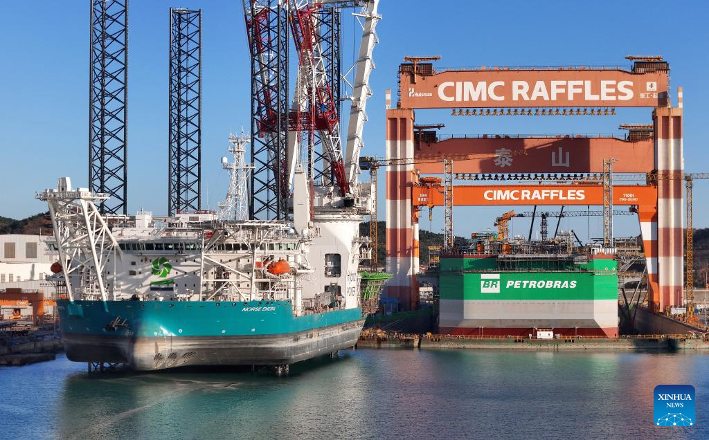 JINAN, 28 diciembre, 2025 (Xinhua) -- Vista aérea tomada con un dron el 24 de diciembre de 2025 del equipo de ingeniería marina realizando trabajos de construcción en la base de CIMC Raffles, en Yantai, en la provincia de Shandong, en el este de China. En los últimos años, Shandong se ha comprometido a construir un clúster industrial de alta gama que integre la construcción naval y los equipos de ingeniería marina en la península de Shandong, emprendiendo una senda de desarrollo de alta calidad impulsada por la economía marina. (Xinhua/Tang Ke)