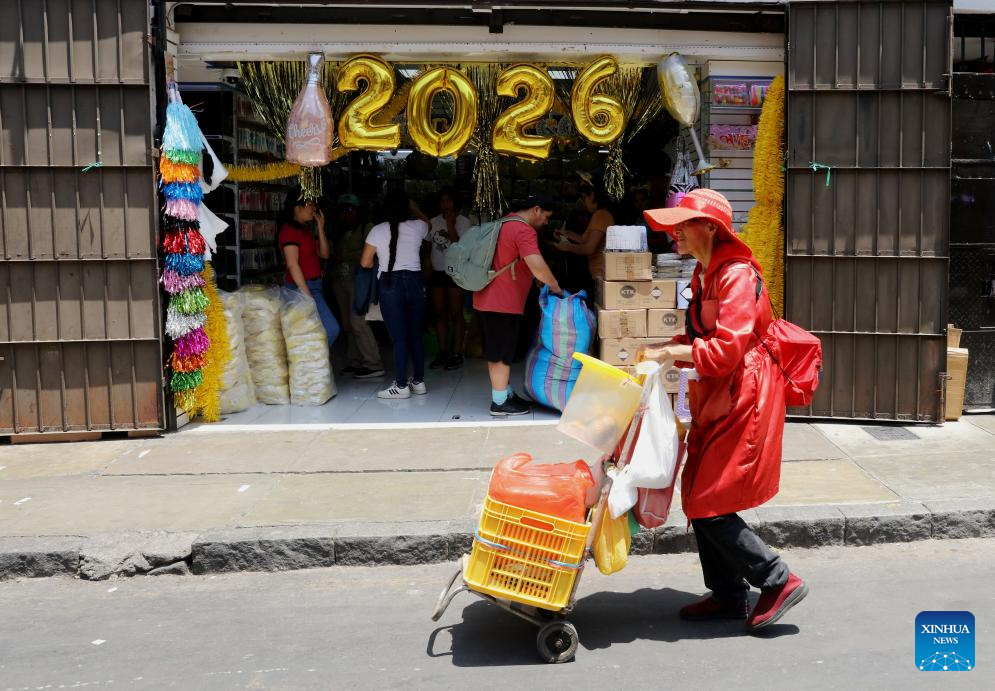 LIMA, 30 diciembre, 2025 (Xinhua) -- Una mujer empuja un carrito para compras frente a una tienda que exhibe un adorno de Año Nuevo, en la zona comercial del centro de Lima, Perú, el 30 de diciembre de 2025. (Xinhua/Mariana Bazo)