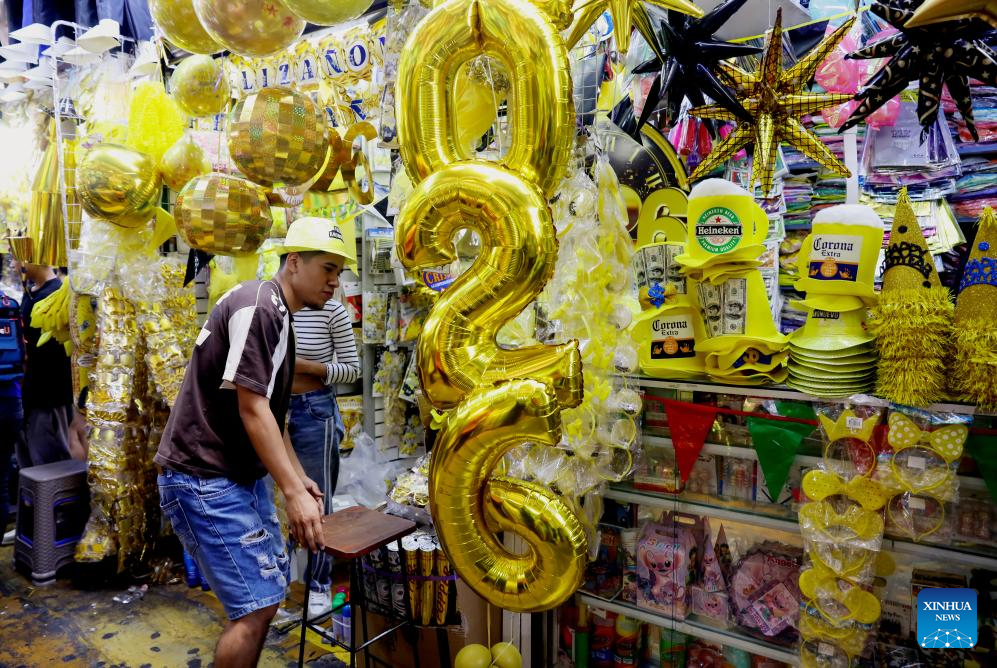 LIMA, 30 diciembre, 2025 (Xinhua) -- Un vendedor acomoda adornos de Año Nuevo en un puesto de un mercado, en la zona comercial del centro de Lima, Perú, el 30 de diciembre de 2025. (Xinhua/Mariana Bazo)