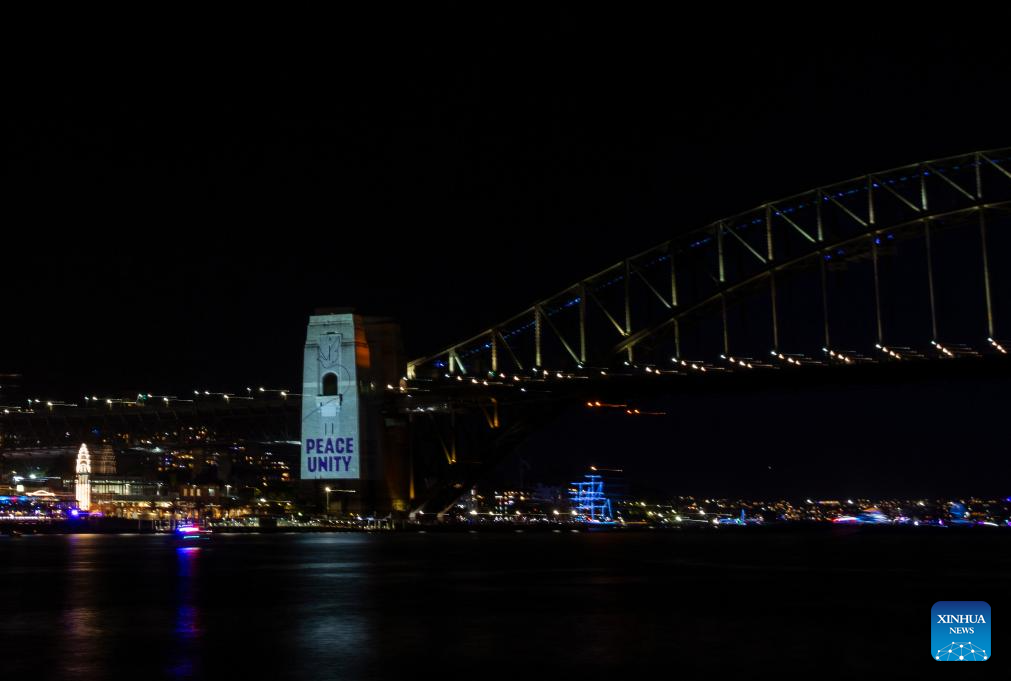 SIDNEY, 31 diciembre, 2025 (Xinhua) -- El Puente del Puerto de Sídney se ilumina con luces blancas mostrando las palabras "Paz" y "Unidad" junto con el símbolo de una paloma, en Sídney, Australia, el 31 de diciembre de 2025. Se guardó un minuto de silencio durante un espectáculo de fuegos artificiales, con el Puente del Puerto iluminado de blanco, para conmemorar a las víctimas del tiroteo masivo ocurrido en la playa Bondi de Sídney. (Xinhua/Ma Ping)