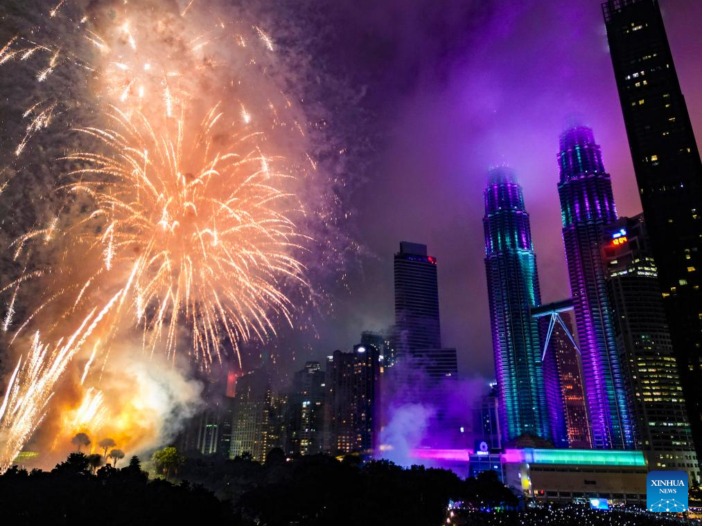 KUALA LUMPUR, 31 diciembre, 2025 (Xinhua) -- Vista aérea tomada con un dron el 1 de enero de 2026 de fuegos artificiales explotando en el cielo en celebración por el Año Nuevo, en Kuala Lumpur, Malasia. (Xinhua/Cheng Yiheng)
