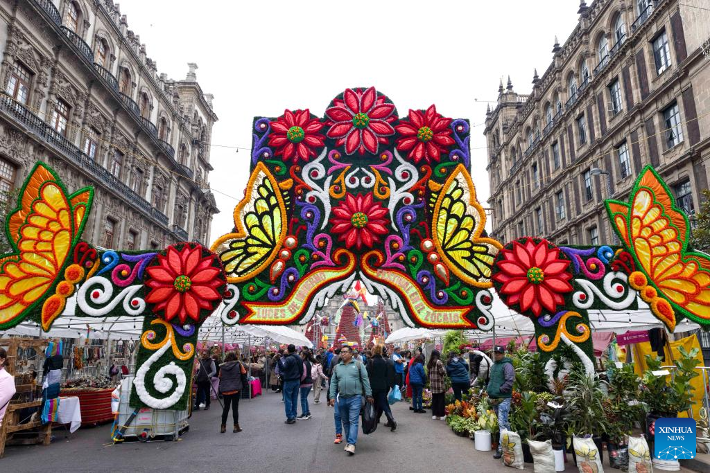 CIUDAD DE MEXICO, 31 diciembre, 2025 (Xinhua) -- Imagen del 30 de diciembre de 2025 de personas caminando frente a decoraciones de año nuevo cerca de la plaza del Zócalo, en la Ciudad de México, capital de México. A medida que se acerca el año 2026, decoraciones festivas se ven en toda la Ciudad de México, llenando la ciudad con un fuerte ambiente de Año Nuevo. (Xinhua/Li Mengxin)