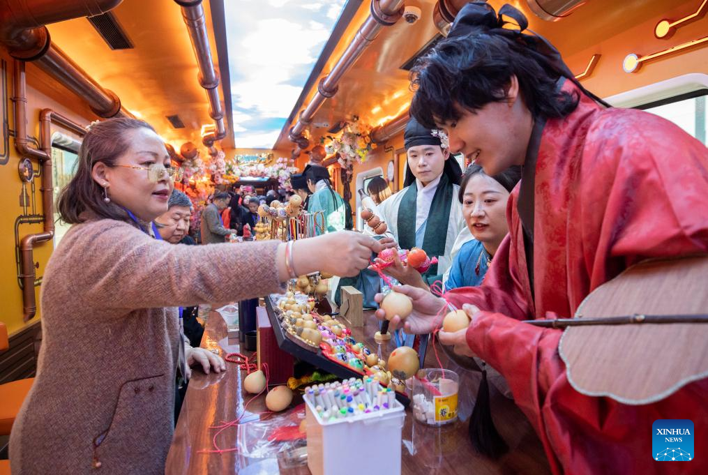 BEIJING, 1 enero, 2026 (Xinhua) -- Turistas aprenden sobre el patrimonio cultural inmaterial en un tren temático que corre desde la Estación de Ferrocarril de Beijing hasta la Estación de Ferrocarril del Norte de Tianjin, el 1 de enero de 2026. El "Tianjin Fantasy Express" ha comenzado un servicio regular de ida y vuelta entre la Estación de Ferrocarril del Norte de Tianjin y la Estación de Ferrocarril de Beijing desde el jueves. La línea cuenta con 10 vagones con temáticas distintivas que combinan representaciones artísticas, presentaciones culturales y experiencias sobre el patrimonio cultural inmaterial. (Xinhua/Zhang Fan)