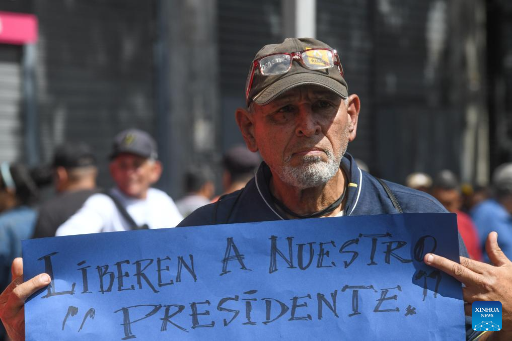 CARACAS, 3 enero, 2026 (Xinhua) -- Personas se manifiestan en las inmediaciones del Palacio de Miraflores, en Caracas, capital de Venezuela, el 3 de enero de 2026. Varios gobiernos latinoamericanos, de diferentes signos políticos, condenaron el sábado la agresión lanzada por Estados Unidos contra Venezuela y la captura del presidente venezolano, Nicolás Maduro, y de su esposa, Cilia Flores. (Xinhua/Marcos Salgado)
