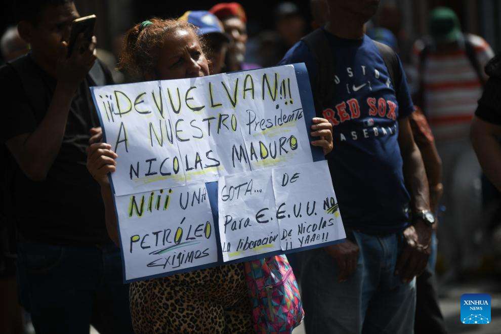CARACAS, 3 enero, 2026 (Xinhua) -- Un hombre sostiene una pancarta en las inmediaciones del Palacio de Miraflores, en Caracas, capital de Venezuela, el 3 de enero de 2026. Varios gobiernos latinoamericanos, de diferentes signos políticos, condenaron el sábado la agresión lanzada por Estados Unidos contra Venezuela y la captura del presidente venezolano, Nicolás Maduro, y de su esposa, Cilia Flores. (Xinhua/Marcos Salgado)