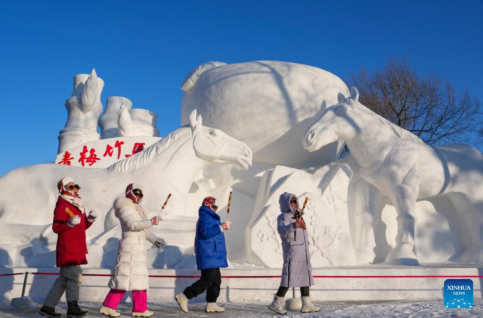 HARBIN, 9 enero, 2026 (Xinhua) -- Imagen del 7 de enero de 2026 de turistas posando para fotografías con una escultura de nieve mientras visitan la 38 Exposición Internacional de Arte de Esculturas de Nieve de la Isla del Sol, en Harbin, en la provincia de Heilongjiang, en el noreste de China. La exposición de arte de esculturas de nieve en curso, con una superficie de exhibición de 1,5 millones de metros cuadrados, atrae a los visitantes con sus impresionantes paisajes de hielo y nieve. (Xinhua/Wang Jianwei)