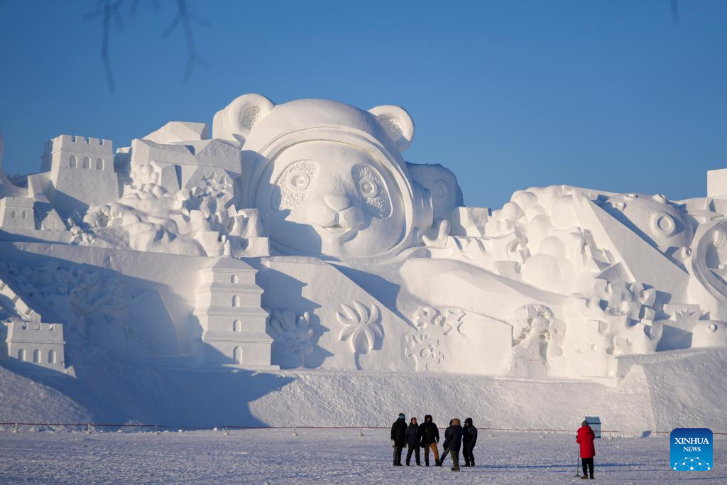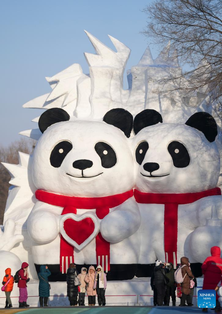 HARBIN, 9 enero, 2026 (Xinhua) -- Imagen del 7 de enero de 2026 de turistas tomándose fotografías con esculturas de nieve con forma de panda gigante mientras visitan la 38 Exposición Internacional de Arte de Esculturas de Nieve de la Isla del Sol, en Harbin, en la provincia de Heilongjiang, en el noreste de China. La exposición de arte de esculturas de nieve en curso, con una superficie de exhibición de 1,5 millones de metros cuadrados, atrae a los visitantes con sus impresionantes paisajes de hielo y nieve. (Xinhua/Wang Jianwei)