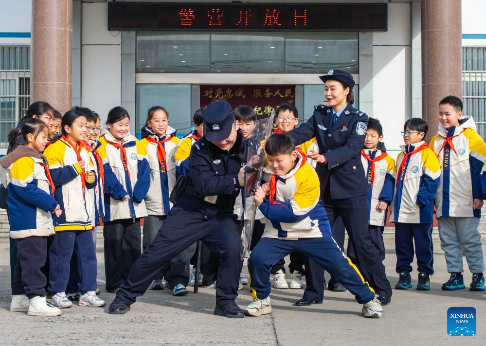 BEIJING, 10 enero, 2026 (Xinhua) -- Imagen tomada con un dron de un alumno experimentando un enfrentamiento con un oficial de policía que sostiene equipo policial, en Taizhou, en la provincia de Jiangsu, en el este de China, el 10 de enero de 2026. Diversas actividades se llevaron a cabo a nivel nacional para conmemorar el sexto Día de la Policía Popular China. (Xinhua/Tang Dehong)