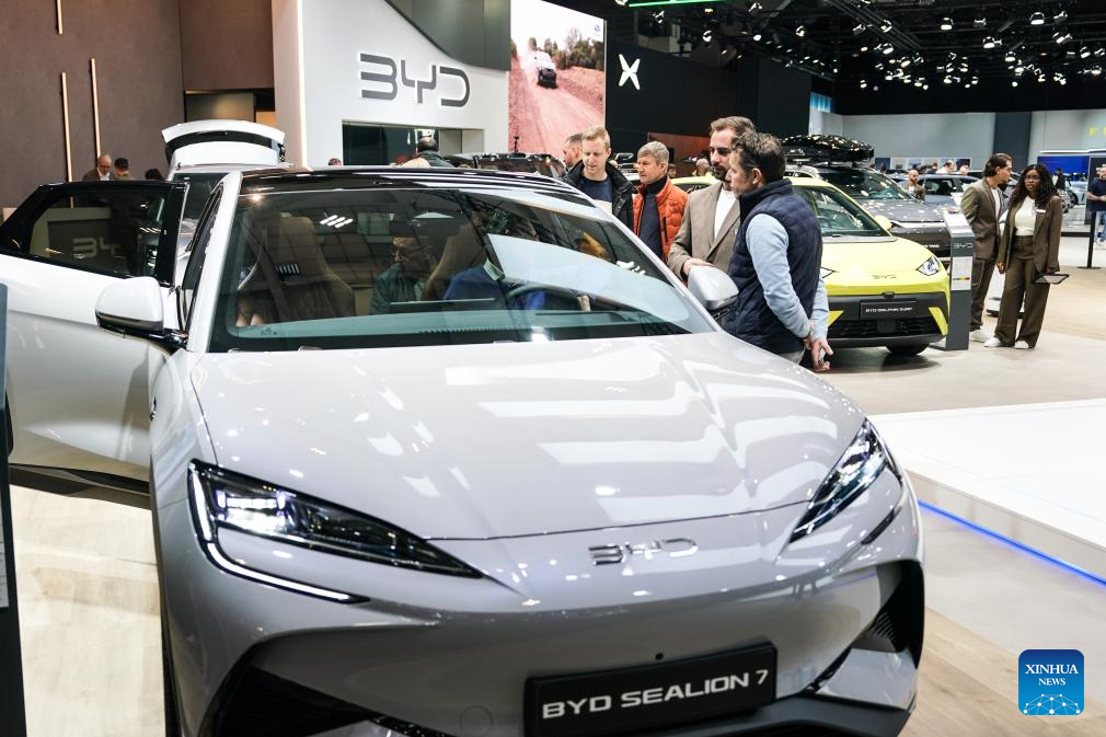 BRUSELAS, 11 enero, 2026 (Xinhua) -- Imagen del 10 de enero de 2026 de personas observando un automóvil BYD durante el Salón del Automóvil de Bruselas, en Bruselas, Bélgica. La 102 edición del Salón del Automóvil de Bruselas se celebra aquí del 9 al 18 de enero. (Xinhua/Peng Ziyang)