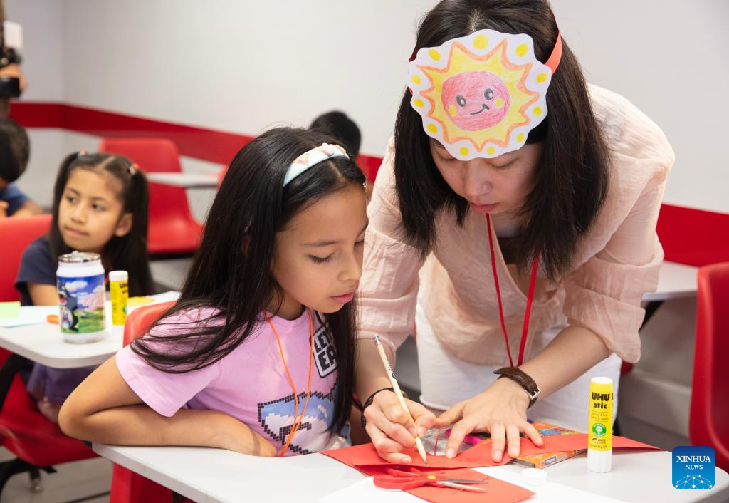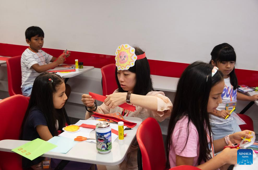 Imagen del 13 de enero de 2026 de una profesora (c) impartiendo una lección de manualidades a una estudiante durante los denominados "Talleres de verano 2026" organizados por el Instituto Confucio (IC) de la Pontificia Universidad Católica del Perú (PUCP), en Lima, Perú. Niños peruanos participan muy emocionados durante este verano en los talleres organizados por el IC de la PUCP para lograr y consolidar su acercamiento a la cultura china mediante actividades educativas y recreativas. (Xinhua/Mariana Bazo)