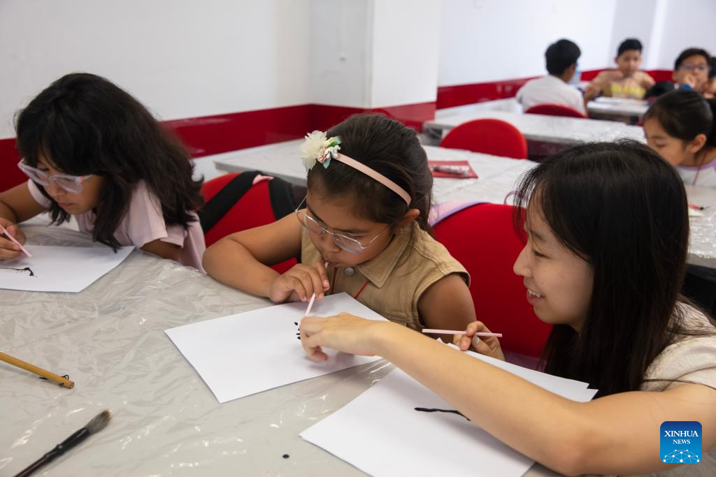 Imagen del 13 de enero de 2026 de una profesora (d) impartiendo una lección de pintura a estudiantes durante los denominados "Talleres de verano 2026" organizados por el Instituto Confucio (IC) de la Pontificia Universidad Católica del Perú (PUCP), en Lima, Perú. Niños peruanos participan muy emocionados durante este verano en los talleres organizados por el IC de la PUCP para lograr y consolidar su acercamiento a la cultura china mediante actividades educativas y recreativas. (Xinhua/Mariana Bazo)