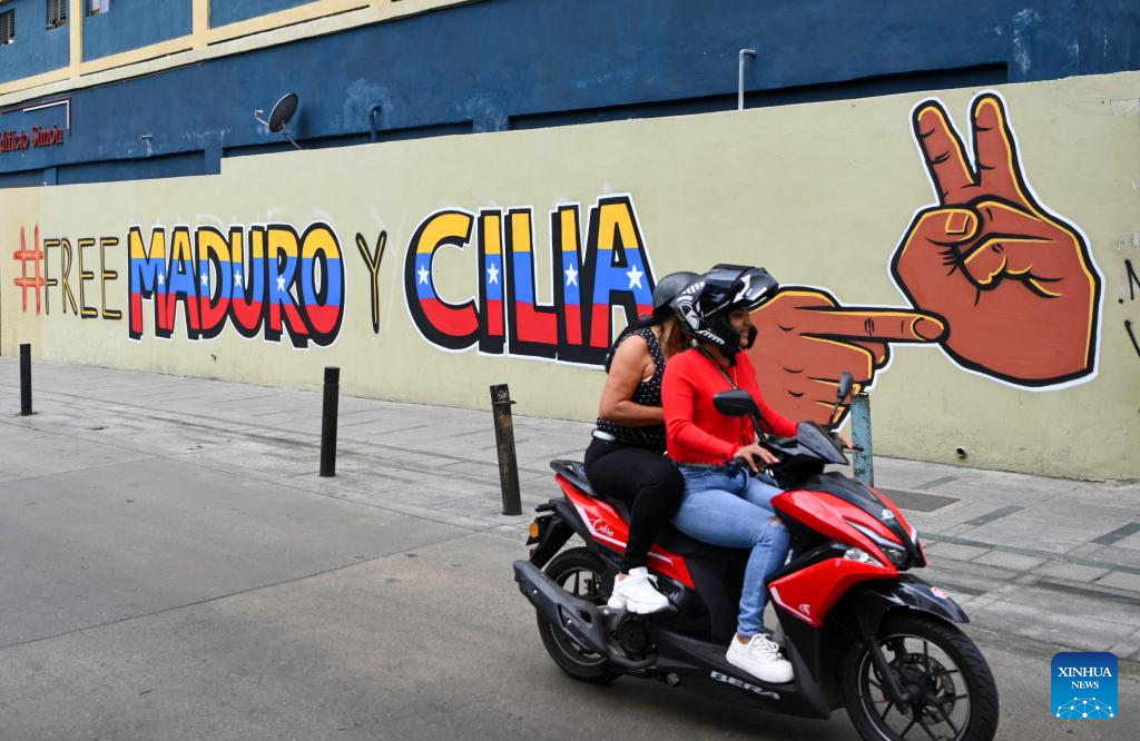 CARACAS, 14 enero, 2026 (Xinhua) -- Imagen del 12 de enero de 2026 de personas circulando en una motocicleta frente a un mural, en Caracas, Venezuela. (Xinhua/Ding Hongfa)
