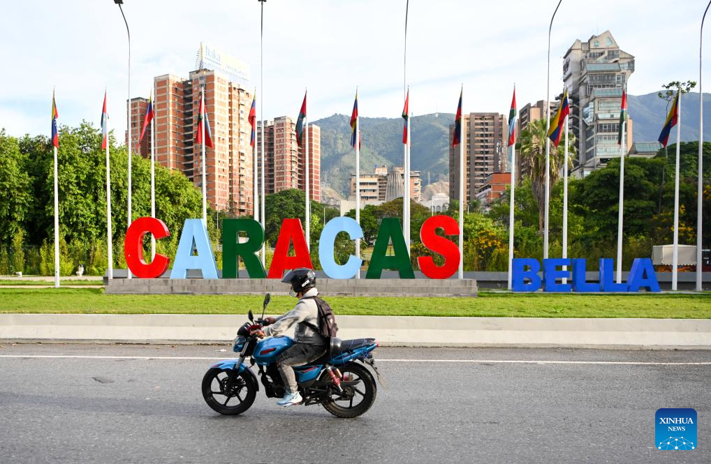 CARACAS, 14 enero, 2026 (Xinhua) -- Imagen del 13 de enero de 2026 de un motociclista circulando frente a un punto de referencia, en Caracas, Venezuela. (Xinhua/Ding Hongfa)